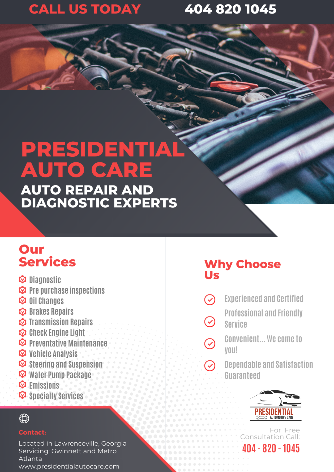 Presidential Auto Care LLC is a mobile mechanic and auto repair service. We come to you at your location at a time of your convenience to take care of your automotive needs. Stranded? Tired of taking time out of your busy schedule? We bring the mechanic shop to you! Our vast expertise enables us to handle it all – diagnostics, preventative maintenance, pre-purchase inspections, electrical systems, minor and major repairs.